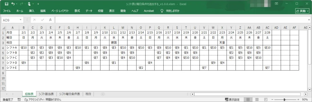 シフト曜日条件表から各シフトの曜日条件を取得し、担務表シートへの割当処理において、その条件に該当するかどうかを判定していきます。